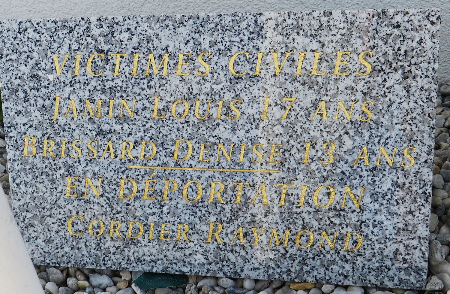 victimes civiles JAMIN Louis 17 ans, BRISSARD Denise 13 ans et en déportation CORDIER Raymond.