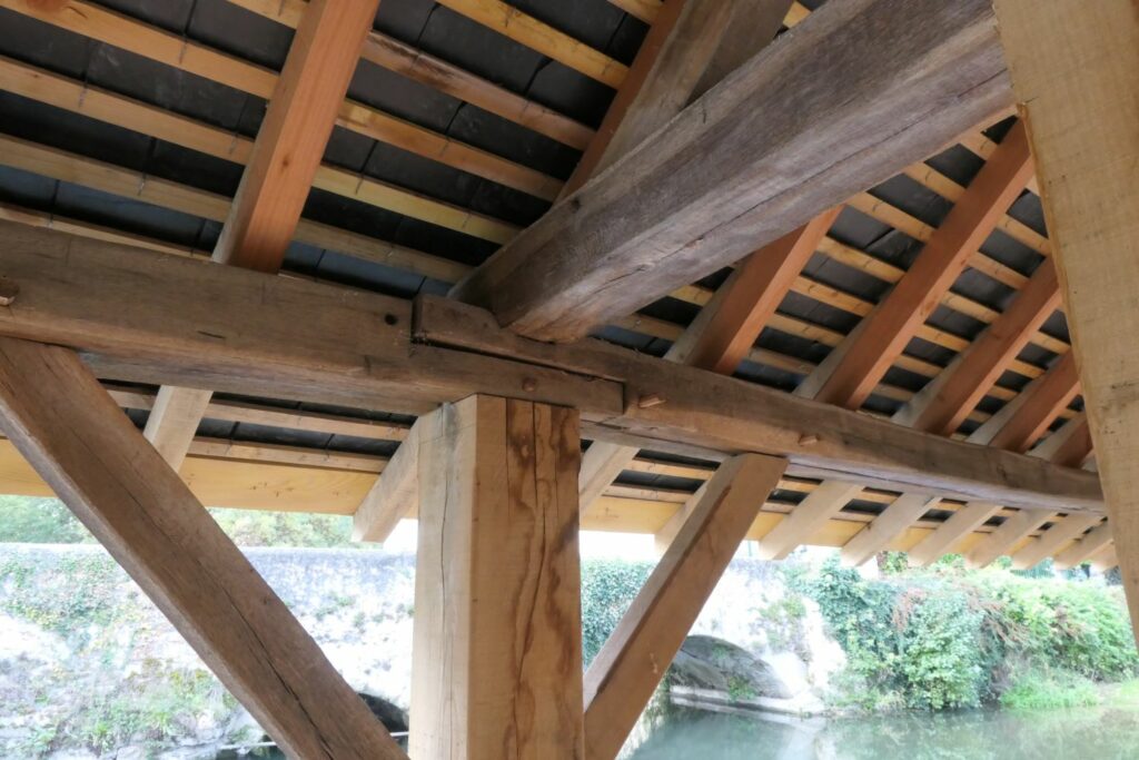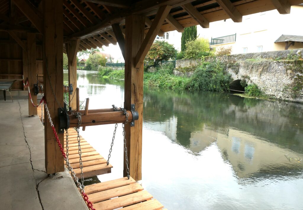 Pour cette restauration, la municipalité a fait appel à Mathias Rivière, charpentier couvreur. La toiture a été refaite, de même que le bardage, les piliers porteurs et le plancher mobile. Les bois en bon état ont été gardés pour le faitage et les sablières. Les assemblages sont faits avec des chevilles en bois. Le bardage est en châtaignier non déligné, les piliers en chêne. Le plancher a été refait avec son système d’élévation.