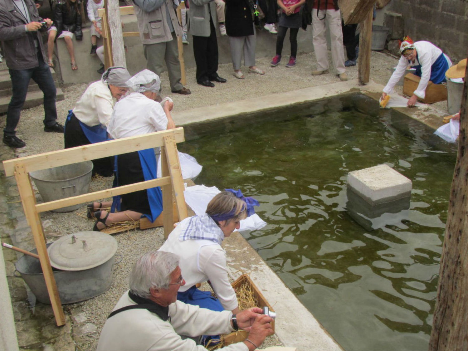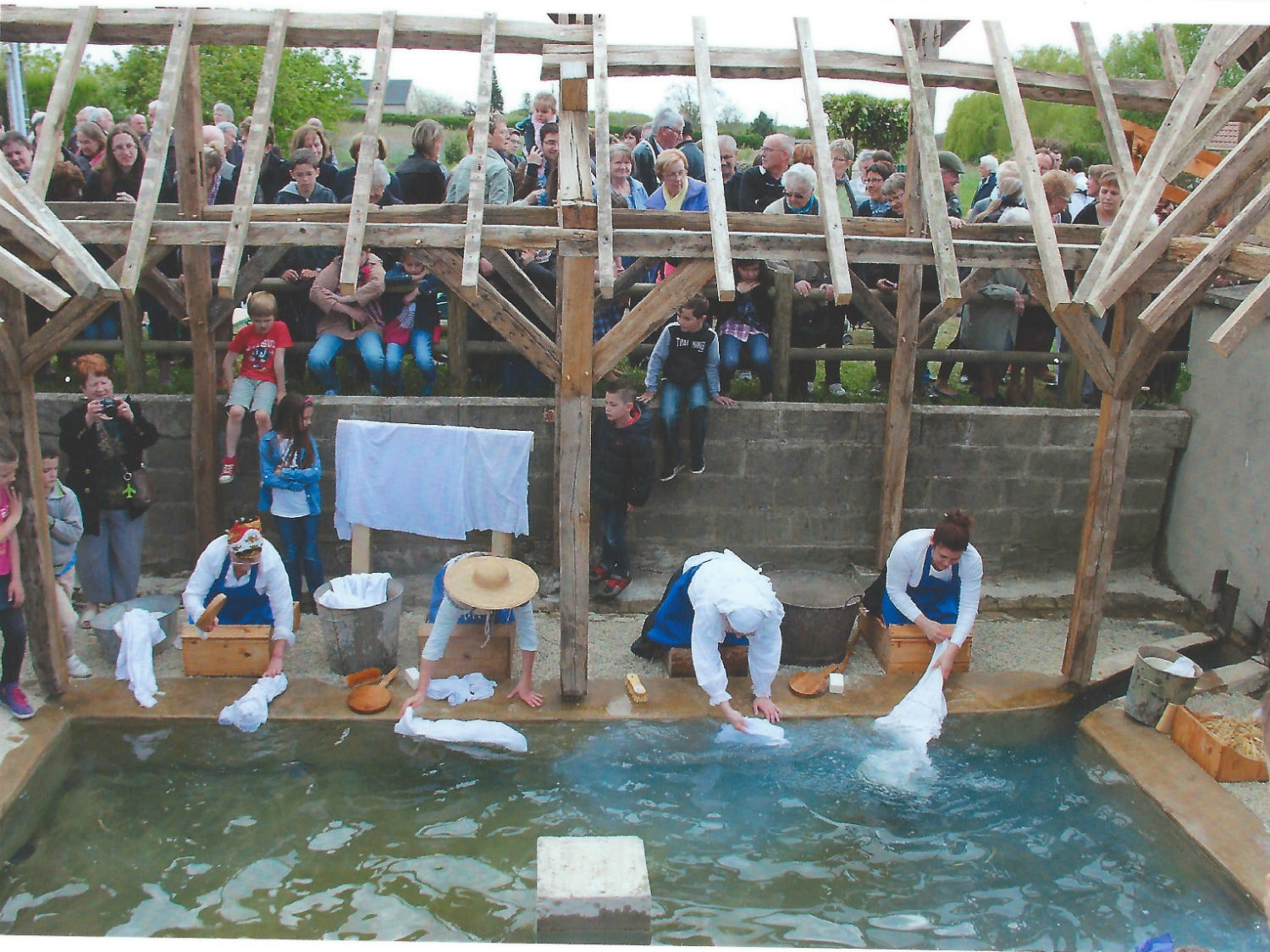 La fête du patrimoine en avril 2014, alors que la restauration est en cours, organisée par les commerçants et les artisans du village sur une suggestion de Michel Guénaux, s’est déroulée sous un soleil radieux sur un week-end. Le samedi après-midi, une visite contée de Requeil puis le dimanche matin, une centaine de personnes étaient au rendez-vous pour la bénédiction du lavoir, effectuée par l’abbé Jean-Louis Germon. L’après-midi, musique en tête, neuf lavandières, en tenue d’époque, chaussées de sabots garnis de paille , ont tiré leur charrette ou brouette chargées de lessive jusqu’au lavoir où elles ont fait revivre le lieu aux 300 personnes présentes. Michel Guenaux pouvait être satisfait de cette participation massive du public pour la sauvegarde du patrimoine du village.