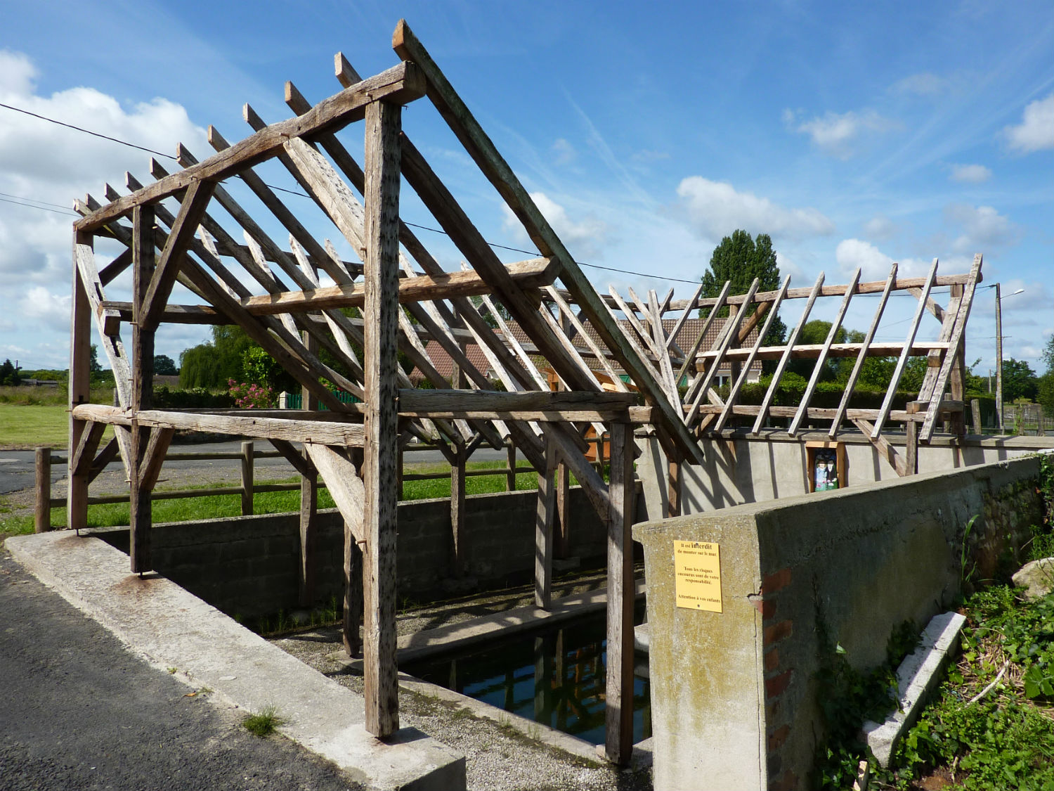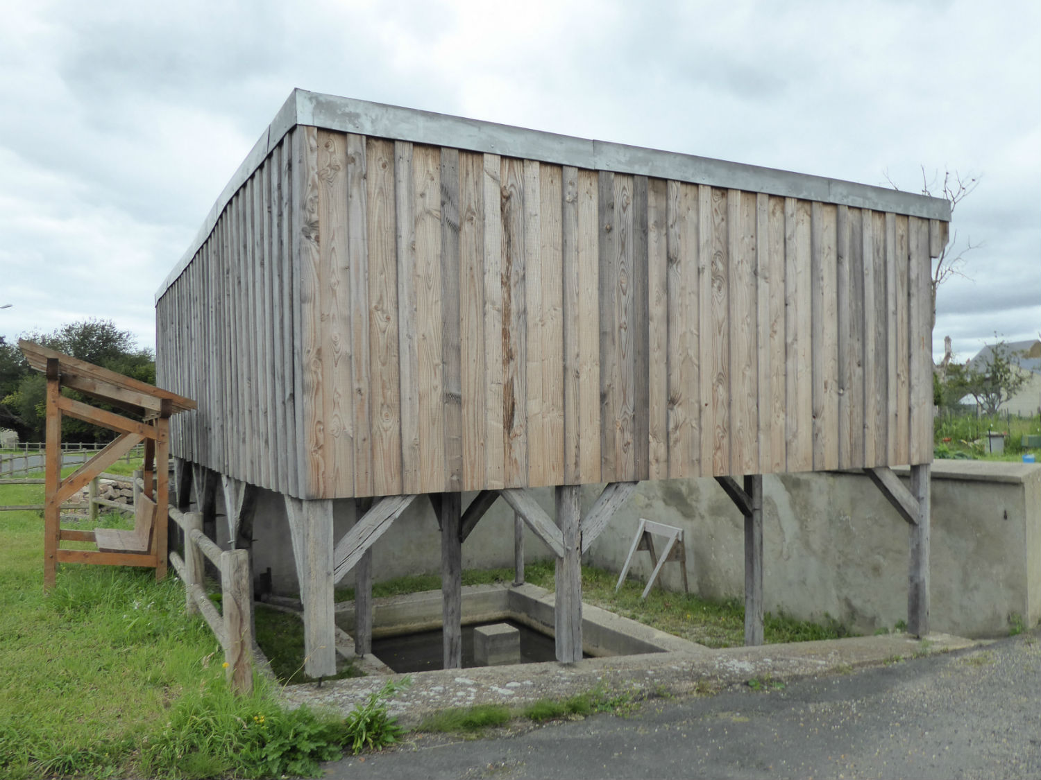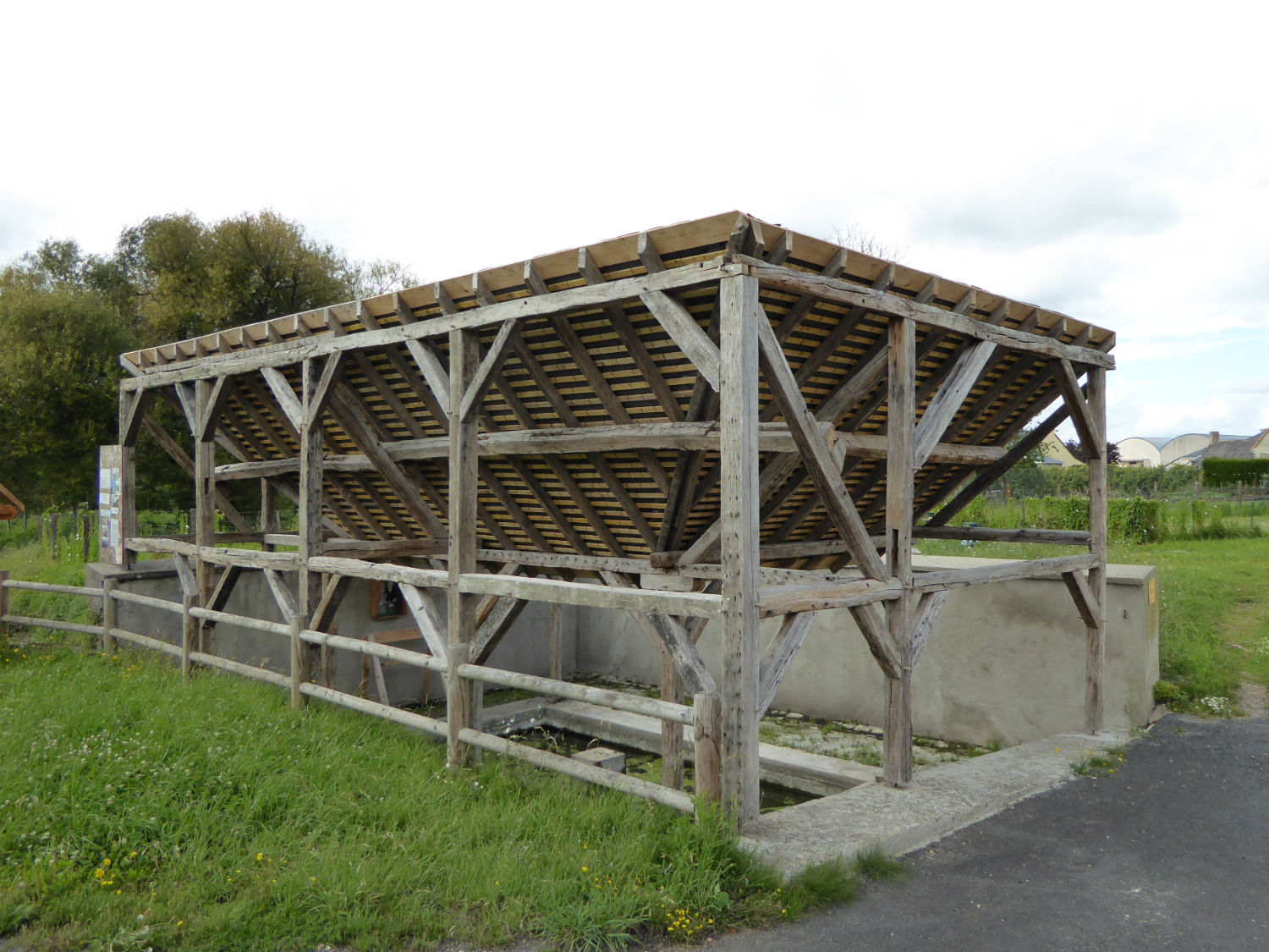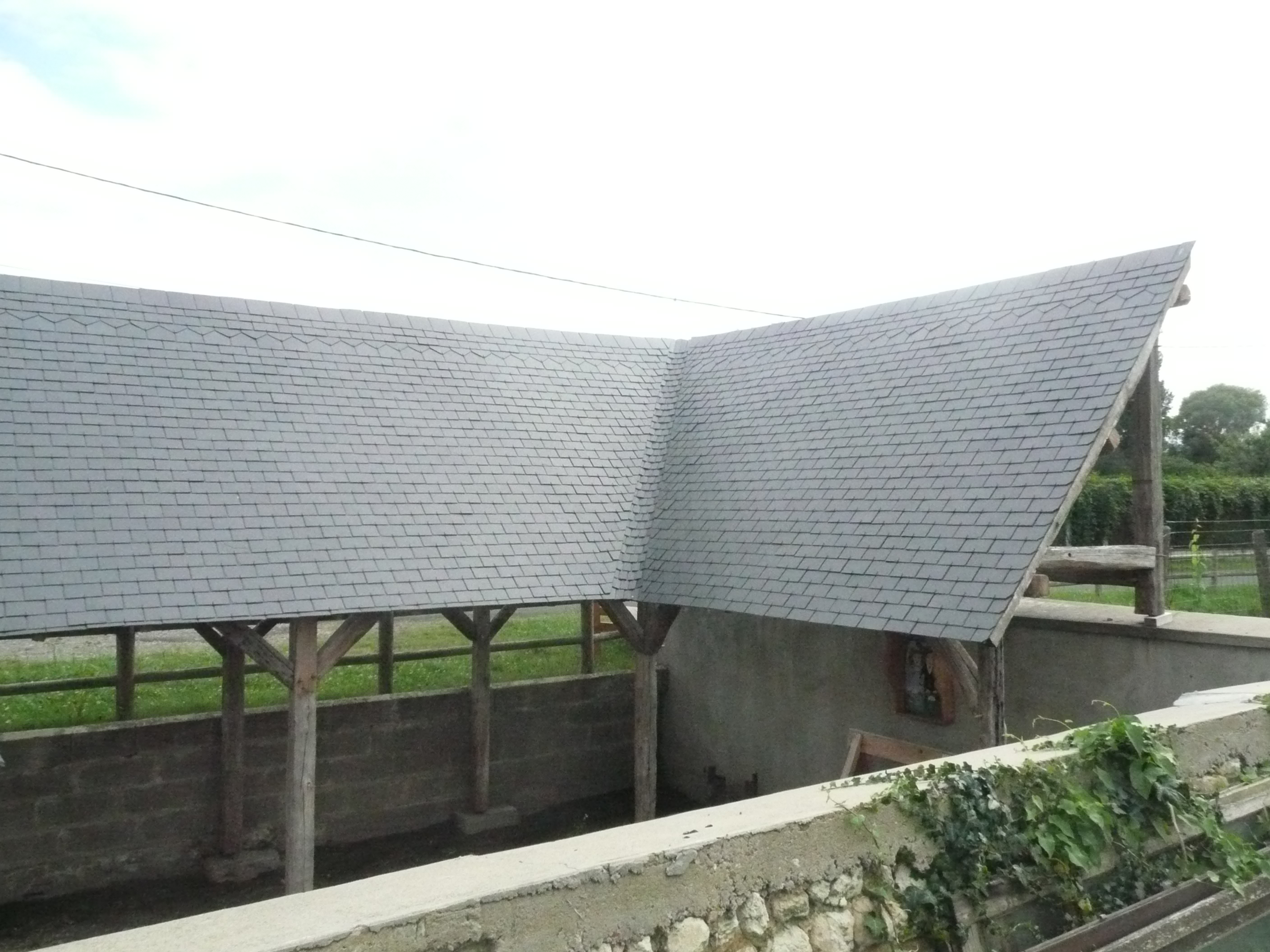 Grâce aux efforts conjugués des artisans, des bénévoles et de la municipalité de Requeil, le lavoir de la fontaine Saint Pierre dont il ne restait que le bassin, a été restauré en 2013-2014. (article Ouest-France du 13 juillet 2014) Cette réhabilitation est due à Michel Jean pour la maçonnerie et Patrick Jouenne et son fils Joseph pour la charpente avec l’aide de Fabien Plessis, Florian Rousseau et Olivier Roiné. Trois esquisses avaient été réalisées; M. Le Hénaff du CAUE en a choisi une et elle correspondait bien au dessin retrouvé dans le dossier des archives départementales. Du bois de récupération a servi à la charpente et le travail s’est déroulé une semaine en août 2013 puis quelques week-end ensuite. Guillaume Monbec, artisan, a pris le relai et a couvert le lavoir en ardoise traditionnelle avec des noues en fendis, alors qu’habituellement elles sont en zinc. C’est la seule partie qui a eu un coût pour la municipalité.