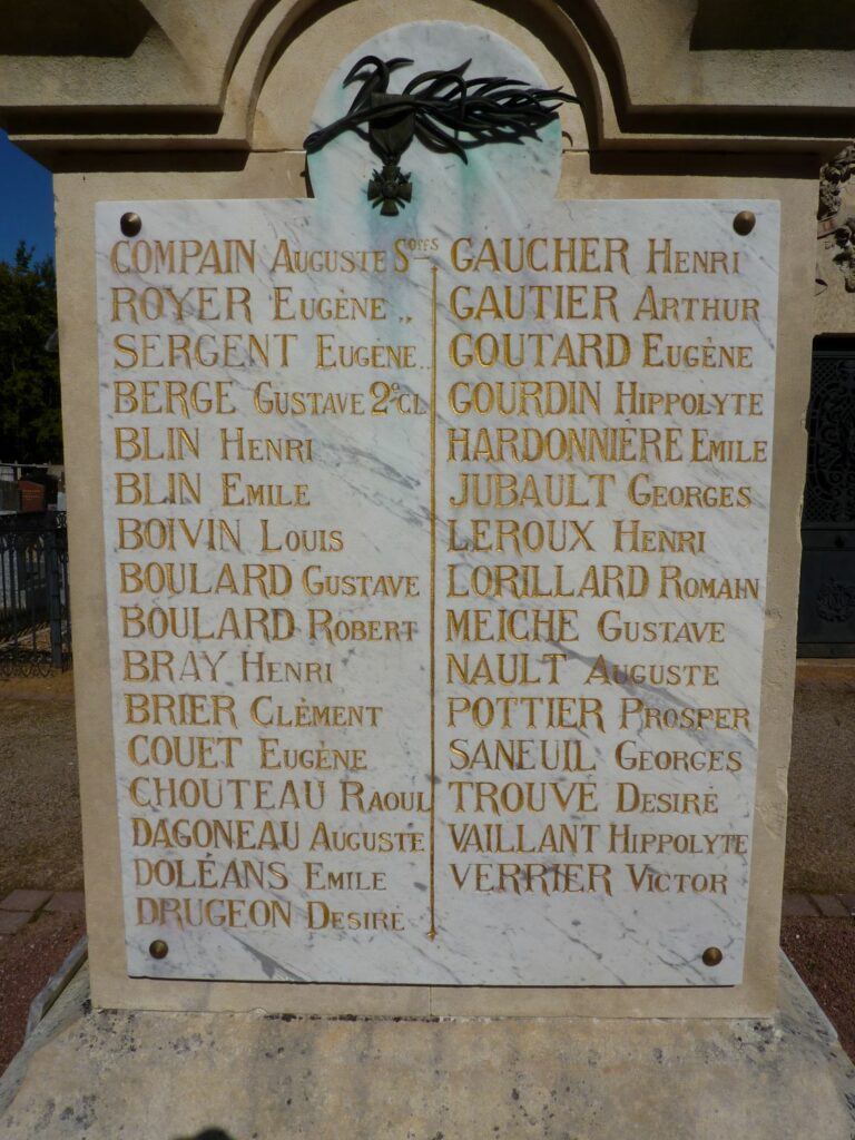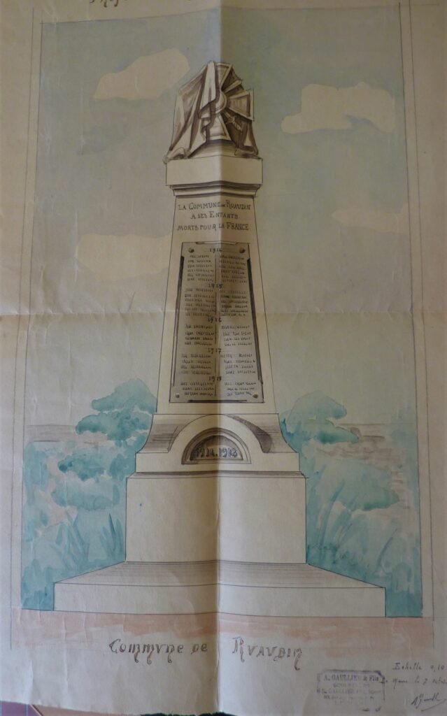 En 1919, un premier projet avec le sculpteur Gaullier n’avait pas été retenu. Le conseil municipal du 12 juin 1920, suite au devis de 4500 F, choisit le projet de Bachelot fils, entrepreneur de monument funéraire, rue de Villeneuve au Mans. Le marché est conclu en novembre. La souscription de 1576F permettra de payer en partie ce monument réalisé en pierre de Lavoux.